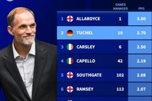 体育资讯2月12日讯 图赫尔正式与英格兰队续约至2028年,德转也盘点了英格兰队史场均积分最高主帅榜单,具体如下: